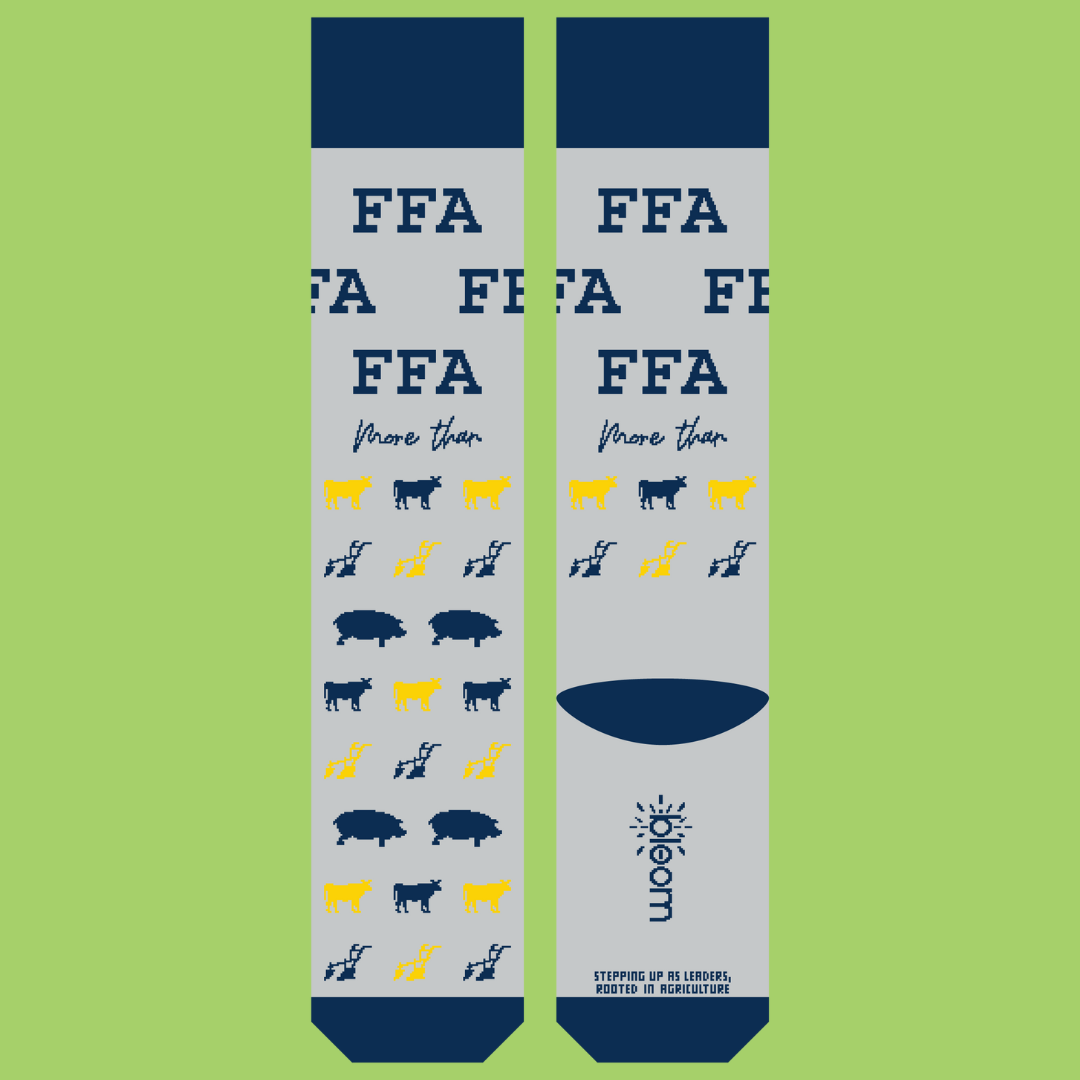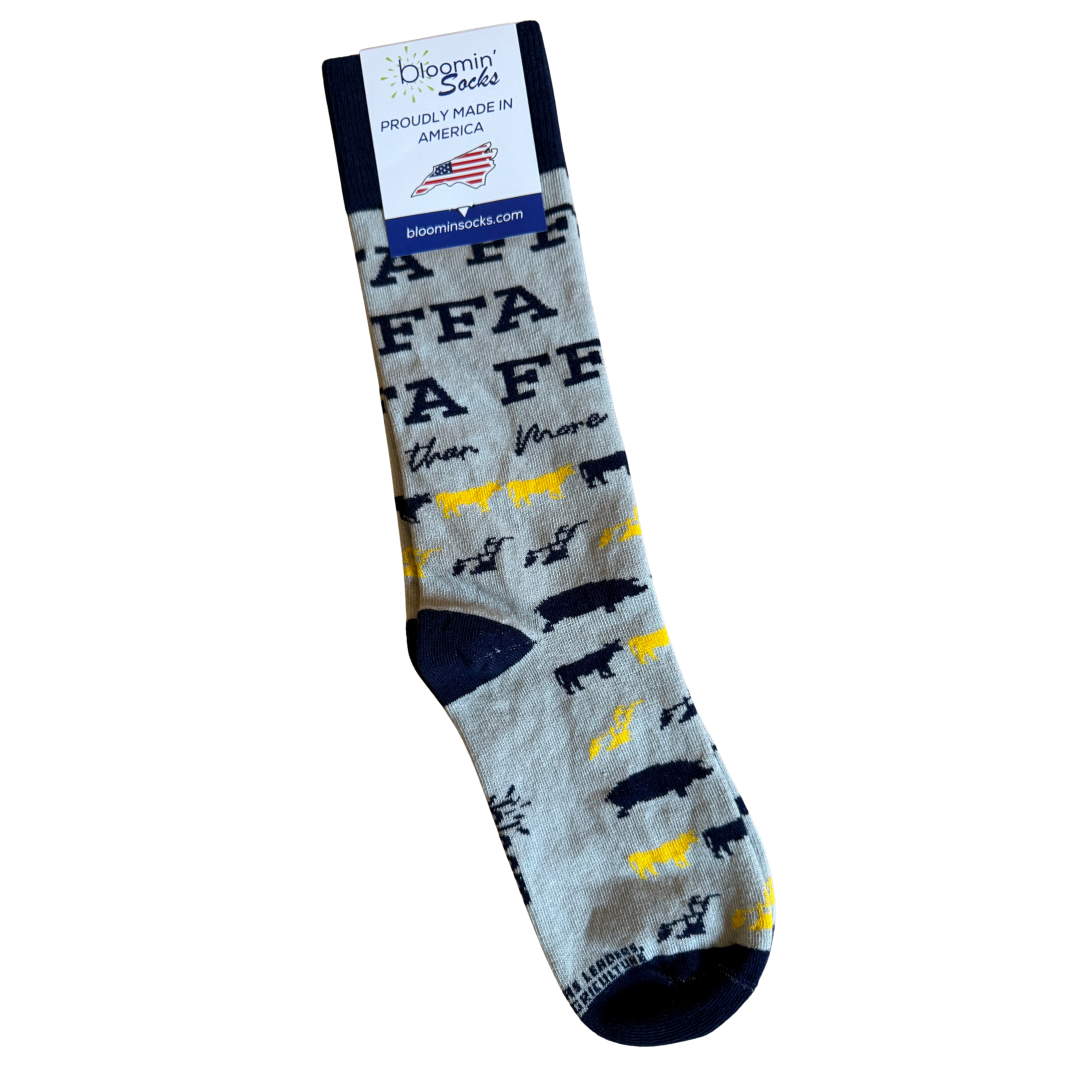 This sock celebrates everything FFA stands for, with a playful mix of livestock icons and the reminder that the blue jacket represents so much more than what meets the eye. From classrooms to competitions, barns to boardrooms, these socks are made for members who live the values and wear their pride from the ground up.